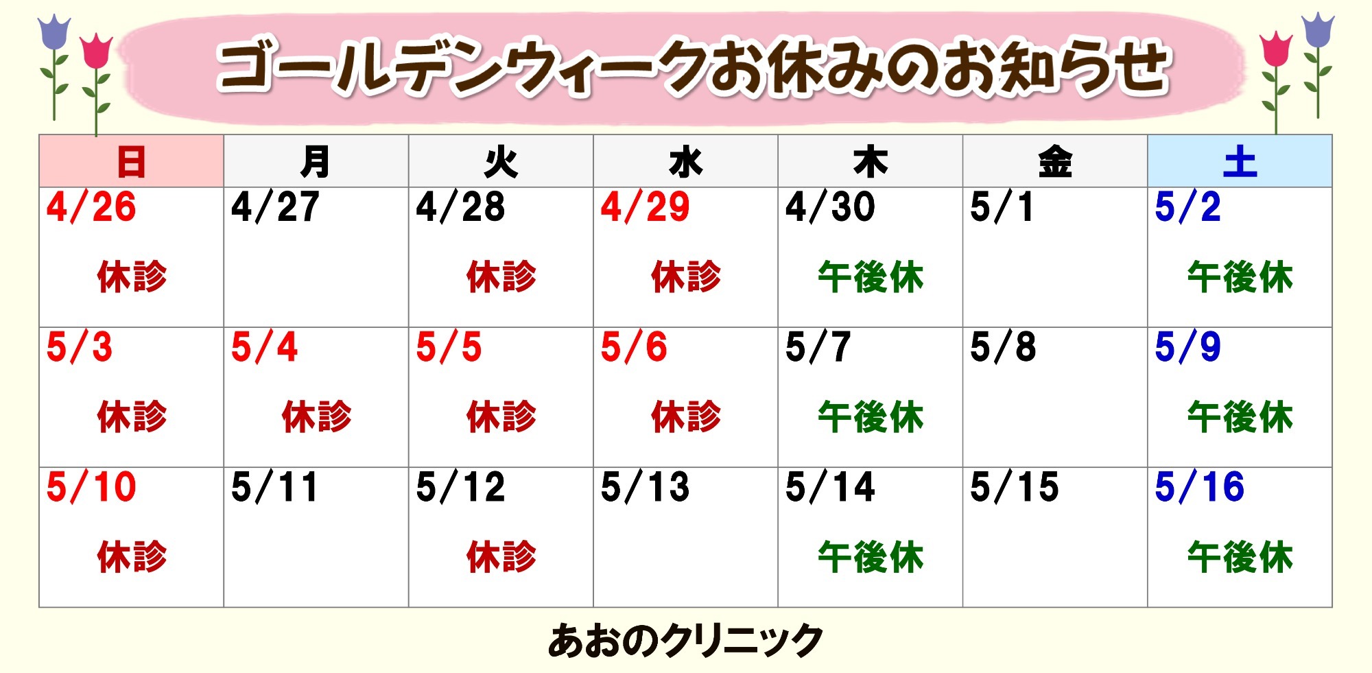 土曜日 診察時間 | 岩城先生 午前9時から午後1時まで | 午後休診 |